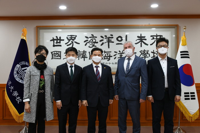 ▲도덕희 한국해양대학교 총장, 옌스 달렌테르프 부사장 항해융학부 정진성 [주한 독일 명예영사]교수 및 관계자들이 기념촬영을 하고 있다 [부산 해양대학교 제공] |