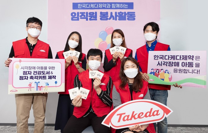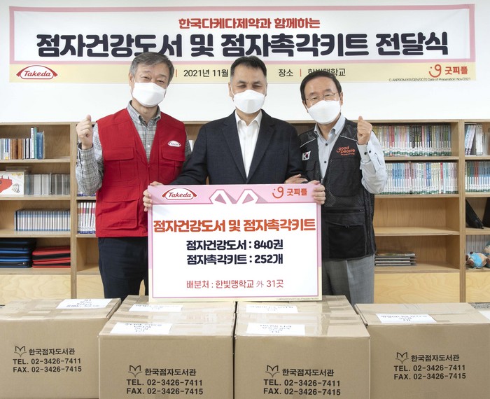 한국다케다제약(대표 문희석)은 지난 22일 국제구호개발 NGO 굿피플과 함께 한빛맹학교를 포함한 32곳 기관의 시각장애 학생들에게 점자 건강도서 840권 및 점자 촉각키트 252개를 제작, 전달하는 사회책임활동(CSR)을 펼쳤다고 밝혔다.