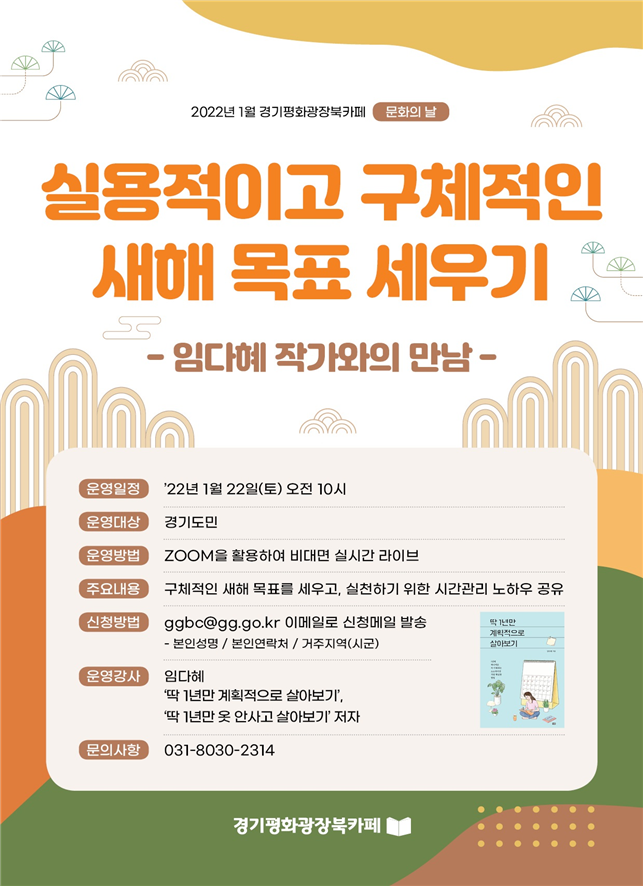 [로컬세계 이혁중 기자]경기도는 임인년 새해를 맞아 코로나19 장기화로 독서·문화 활동이 어려운 도민들을 위해 경기평화광장 북카페에서 올해 첫 ‘문화의 날’ 강좌를 마련했다고 13일 밝혔다.