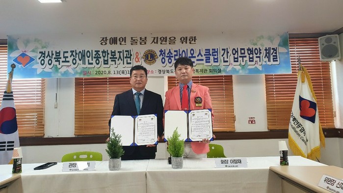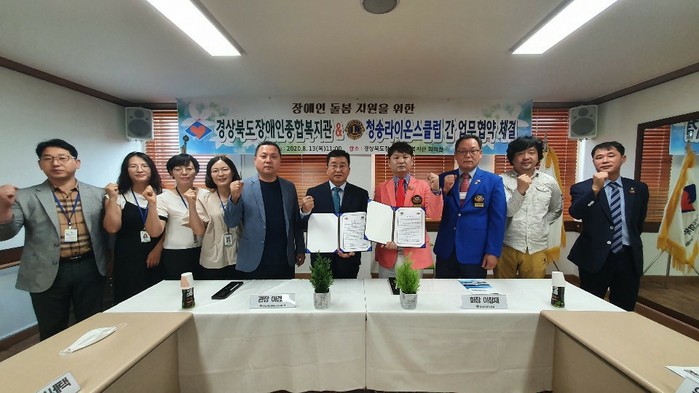 청송클럽에 따르면 지난 13일 경북도 장애인종합복지관에서 이경기 경북도 장애인종합복지관장과 이창재 청송라이온스클럽 회장을 비롯해 클럽 임원들, 신채희 국제라이온스협회 356-E(경북)지구 4지역 1지대위원장, 복지관의 직원 등이 참석한 가운데 청송지역 저소득 장애인 돌봄 사업 협력을 위해 업무협약(MOU)을 체결했다고 17일 밝혔다.