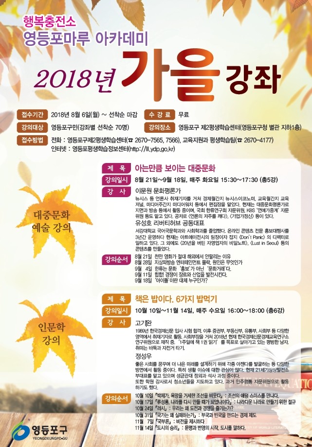 [로컬세계 이명호 기자]서울 영등포구가 ‘영등포마루 아카데미’ 가을 강좌를 개설하고 수강생을 모집한다고 8일 밝혔다.