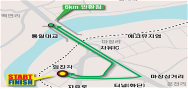 | ▲걷기대회 6㎞ 코스- 임진각 출발 → 마정교차로 → 통일대교(반환점) → 마정2리 입구 삼거리 → 임진각 도착 |