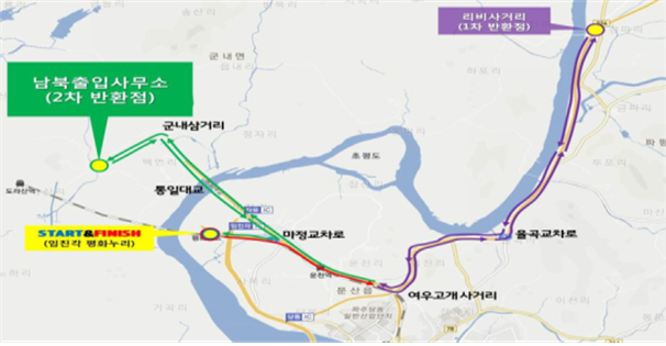 | ▲마라톤 풀코스(42.195㎞) - 임진각 출발 → 여우고개사거리 → 리비사거리(1차 반환점) → 여우고개사거리 → 통일대교 → 남북출입사무소(2차 반환점) → 통일대교 → 임진각 도착. |