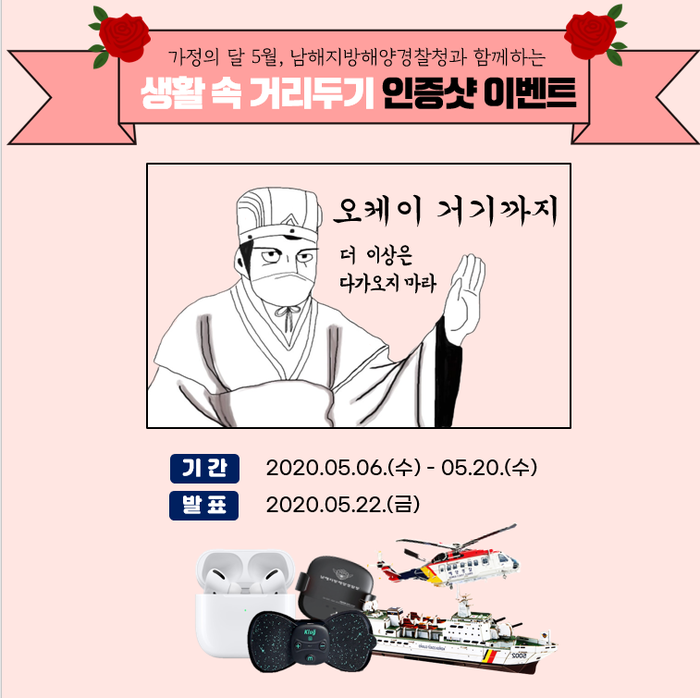 [로컬세계 맹화찬 기자]남해지방해양경찰청(청장 구자영)이 5월 가정의 달을 맞아 가족과 함께하는 “생활 속 거리두기”이벤트를 진행한다.