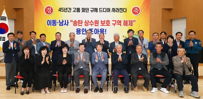 이 시장은 "이동·남사읍 시민들께서 지난 45년 간의 규제로 인해 많은 고통과 불편을 겪으셨는데 드디어 그 질곡에서 벗어나실 수 있게 된 것을 시장도 매우 기쁘게 생각한다"며 "이제 재산권 행사도 하실 수 있고, 보다 좋은 주거공간도 만들 수 있게 됐으니 축하드린다"고 말했다.