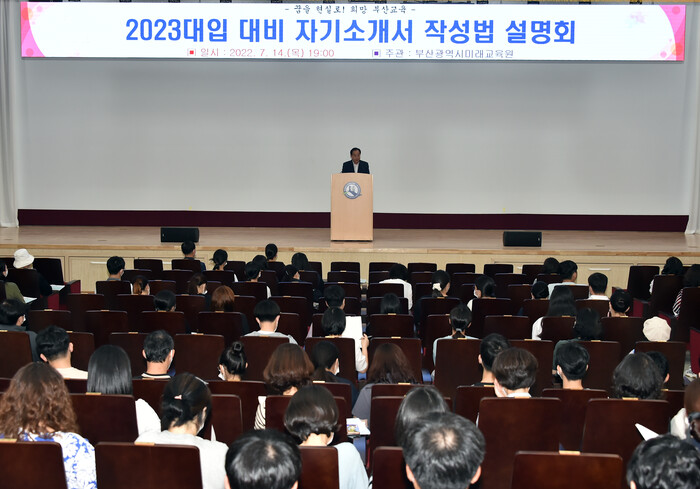 [로컬세계 부산=맹화찬 기자] 하윤수 부산광역시교육감이 14일 오후 7시 부산진구 부산미래교육원 대강당에서 부산지역 고3 학생과 학부모, 교사 등 400여명이 참석한 가운데 열린 ‘2023 대입 대비 자기소개서 작성법 설명회’에서 인사말을 하고 있다.