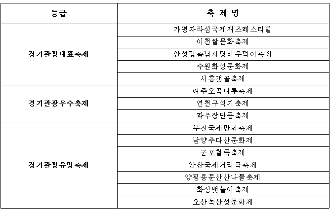 경기관광우수축제로는 여주오곡나루축제, 연천구석기축제, 파주장단콩축제 등 3개가 선정됐으며, 경기관광유망축제에는 부천국제만화축제, 남양주다산문화제, 군포철쭉축제, 안산거리극축제, 양평용문산산나물축제, 화성뱃놀이축제, 오산독산성문화제 등 7개 축제가 선정됐다.
