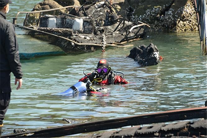 | ▲남해해경청 과학수사팀에서 화재선박에 대한 수중감식을 진행하고 있다. |