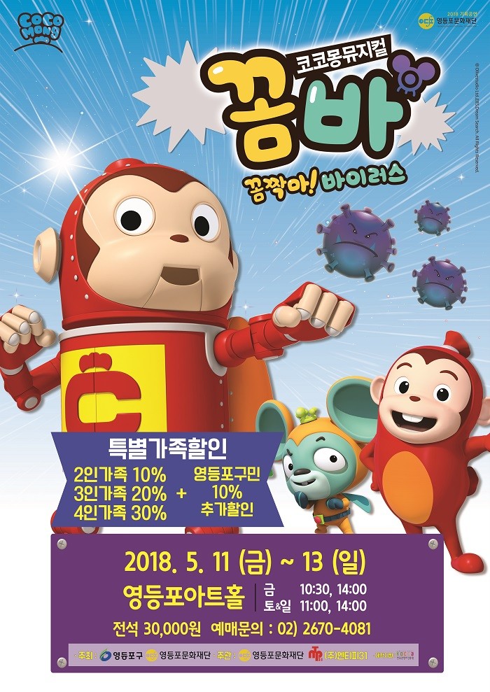 먼저 오는 5월 11일부터 13일까지 어린이뮤지컬 ‘코코몽 꼼짝마! 바이러스’ 공연이 펼쳐진다. 아이들이 좋아하는 애니메이션 주인공 코코몽이 출연해 냉장고 나라에서 벌어지는 모험을 통해 바이러스 예방법과 청결의 중요성에 대해 알려주는 즐거움과 교훈을 동시에 얻을 수 있는 교육뮤지컬이다.