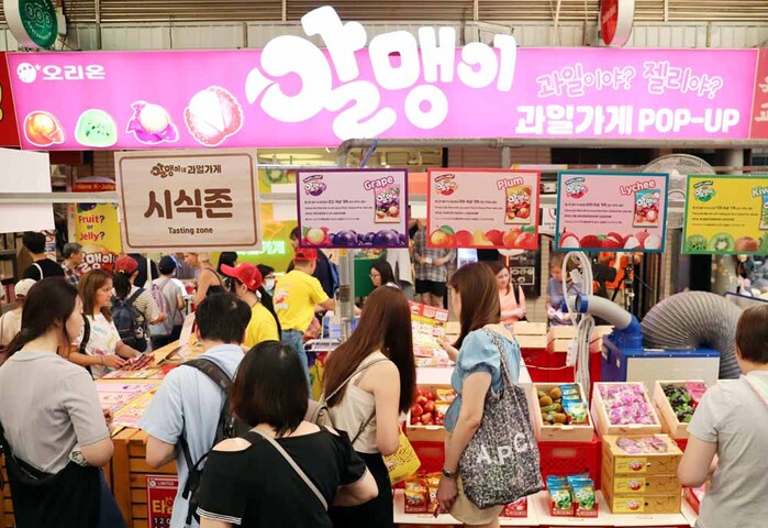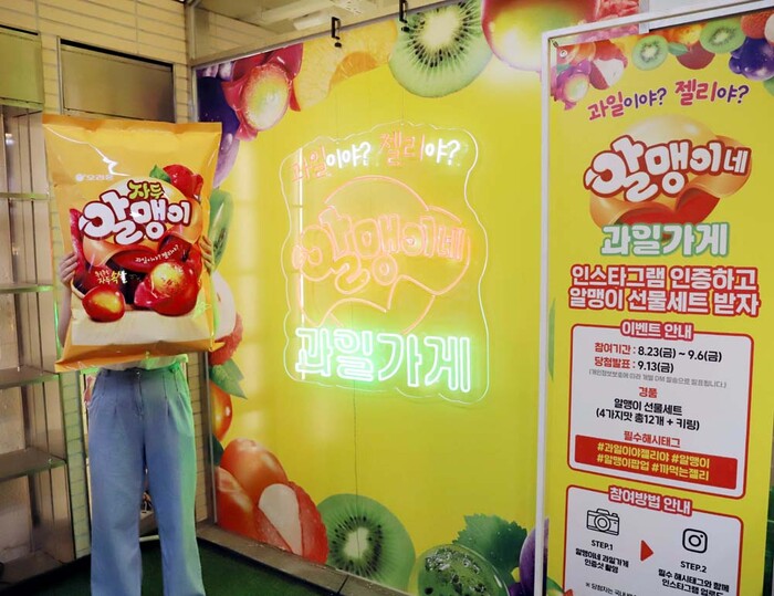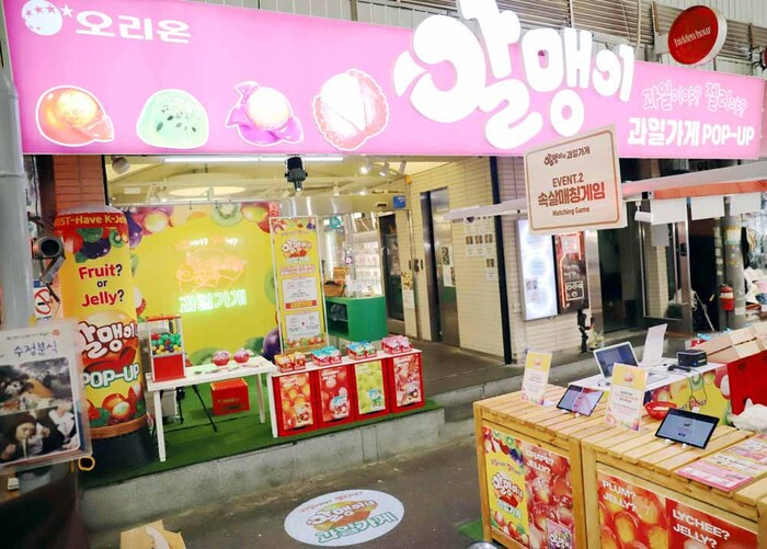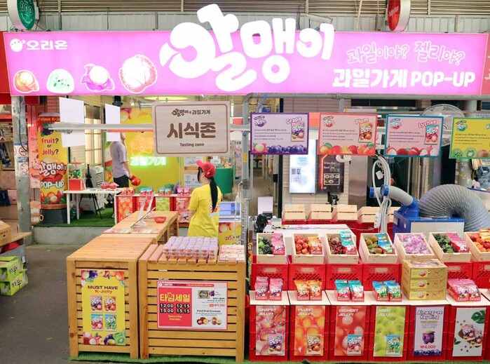 오리온(대표이사 이승준)은 최근 국내 관광의 ‘핫스팟’으로 떠오르고 있는 서울시 종로구 광장시장에서 까먹는 ‘알맹이’ 젤리 팝업스토어 ‘알맹이네 과일가게’를 오픈했다고 26일 밝혔다.