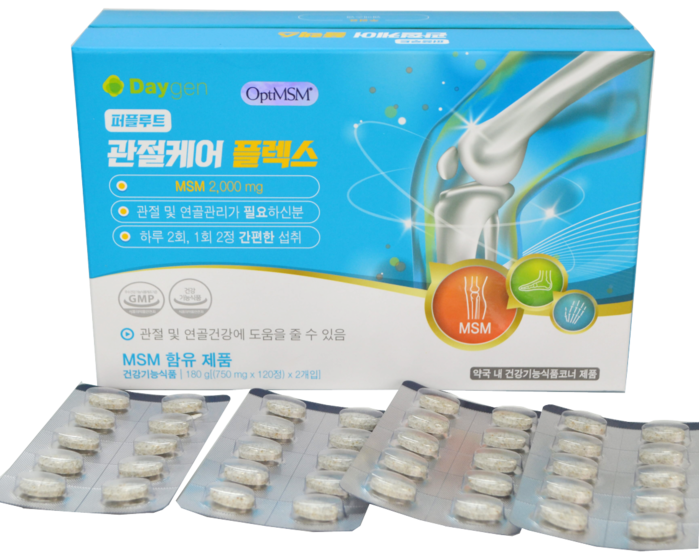 ‘퍼플루트 관절케어 플렉스’는 식약처에서 인정한 관절 및 연골건강에 도움을 주는 기능성원료인 MSM(Methyl Sulfonylmethane, 디메틸설폰)을 주원료로 만든 건강기능식품이다. MSM 일일섭취량 최대치인 2,000mg(일일 권장량 기준)을 함유했으며, 보스웰리아추출분말, 산호칼슘, 지초추출분말, 피쉬콜라겐, 10곡 발효효소분말, 비타민C와 D3, E 등을 부원료로 사용해 건강기능식품으로서 효능도 최대로 높였다.