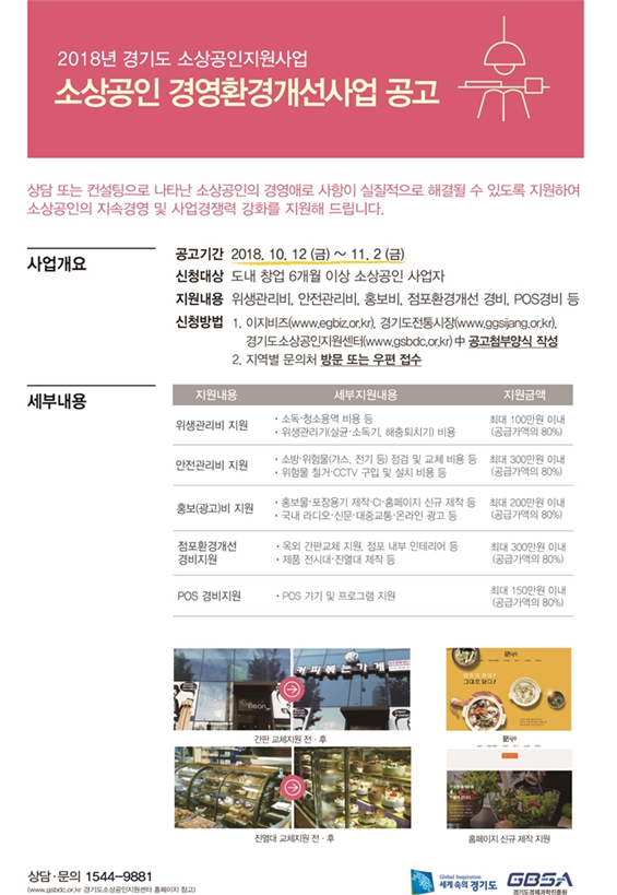 자세한 사항은 도 경제과학진흥원 소상공인지원센터(1544-9881)로 문의하면 된다.