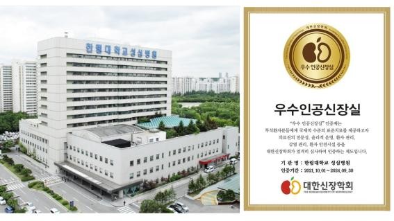 한림대학교성심병원(병원장 유경호)은 대한신장학회에서 주관하는 전국 인공신장실 인증 평가에서 우수 기관 인증을 획득했다.