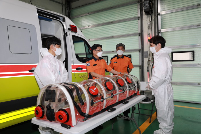 또 코로나19 대응을 위해 소방서별 1대씩 감염병 전담구급대 총 11대와 구급버스 및 소방헬기를 동원하여 확진자를 이송하고 있다.