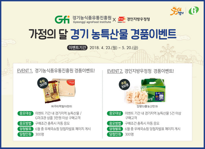 또 이 기간 동안 G마크관에서 3만원 이상 상품 구매고객 중 자동추첨을 통해 300명에게 경기 명품쌀인 여주미력발아현미 1포씩을 사은품으로 지급한다. 동시에 경인지방우정청에서도 경기지역 농·특산물 5건 이상 구매고객에 한해 자동 추첨해 300명에게 양평 다물농산한과를 지급한다.