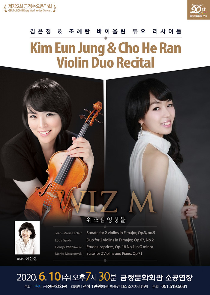 6월 10일에는 ‘김은정&조혜란 바이올린 듀오 리사이틀’이 열린다. 부산체임버오케스트라에서 활동하고 있는 연주자인 김은정과 조혜란은 르클레어와 슈포어가 작곡한 바이올린 듀오 연주를 이진성의 피아노와 함께 펼칠 예정이다.