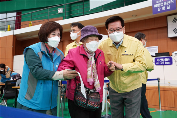 ▲동대문구체육관에 마련된 동대문구 예방접종센터에서 유덕열 동대문구청장(오른쪽)이 접종을 마친 어르신을 안내하고 있다. 동대문구 제공 |
