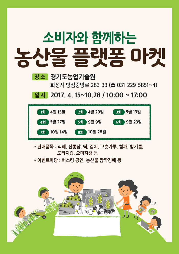 경기농기원은 오는 15일부터 5월 27일까지 둘째, 넷째 토요일마다 농기원 농업과학교육관 앞 잔디밭에서 ‘소비자와 함께하는 경기농산물 플랫폼마켓’을 총 4회 운영한다. 운영시간은 개장일 오전 10시부터 오후 5시까지 7시간이다.