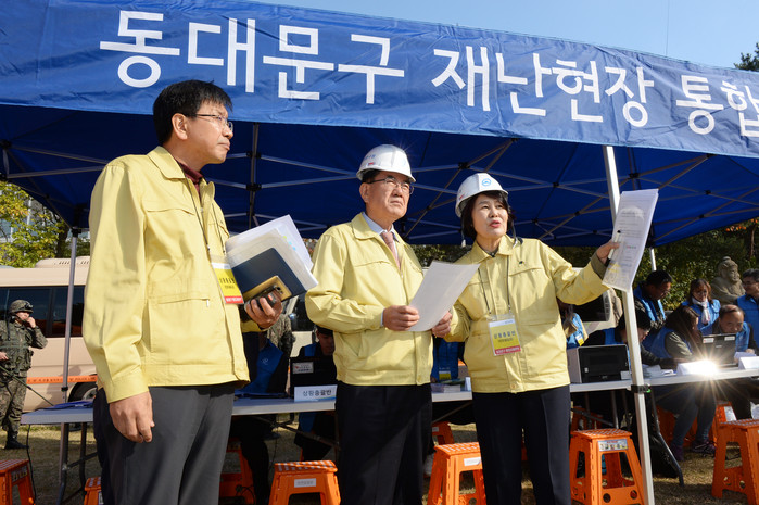 ▲유덕열 구청장이 2017 재난대응안전한국훈련에 참가해 재난현장을 점검하고 있다.(동대문구청 제공) |
