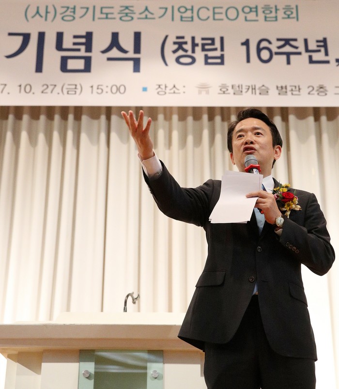 남경필 지사는 27일 오후 4시 수원 호텔 캐슬 그랜드볼룸에서 열린 ‘경기도중소기업CEO연합회 창립기념식’에 참석해 ▲청년연금, ▲청년 마이스터 통장, ▲청년 복지포인트 등 ‘일하는 청년 시리즈’ 사업을 설명하며 기업인들의 참여를 당부했다.
