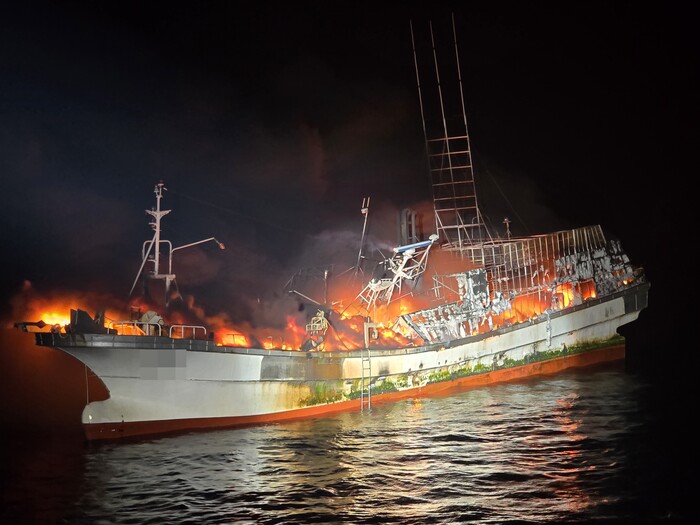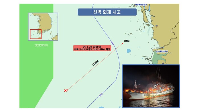 군산해양경찰서는 24일 오후 11시 59분께 군산시 어청도 남서쪽 약 141km 해상에서 조업 중이던 어선 A호(86톤, 근해장어통발, 승선원 12명)에 화재가 발생했다는 신고를 접수하고 경비함정 등 가용세력을 현장으로 급파해 화재 선박 구조와 진압에 총력을 기울이고 있는 것으로 알려졌다.