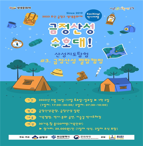 금정구 관계자는 “금정산성 별밤캠핑은 1박 2일 캠핑과 흥미로운 체험 이벤트를 통하여 우리 구의 대표적인 문화유산인 금정산성의 가치를 전달하기 위한 행사로 참가 가족들에게 잊을 수 없는 멋진 추억을 선사해줄 것으로 기대한다”고 말했다.