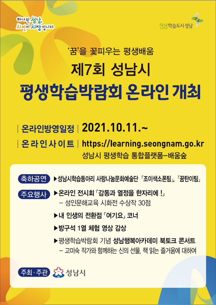 [로컬세계 김병민 기자]경기 성남시(시장 은수미)는 ‘제7회 평생학습박람회’를 오는 10월 11일 온라인으로 개최한다.