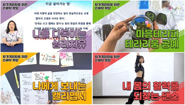 프로그램 내용은 △나를 다독이는 심리치유-넌 혼자가 아니야 △마음테라피 반려식물 테라리움 공예 △나에게 보내는 14일간의 캘리그라피 엽서 △내 몸의 생기와 활력을 되찾는 텐션 업! 댄스 등 자가격리 기간 중 가장 필요한 내용 위주로 구성돼 있다.