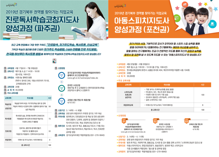 2개 과정으로, 파주권에서 진행하는 ‘진로독서학습코칭지도사’ 과정은 내달 8일까지 모집한다. 포천권 ‘아동스피치지도사’ 과정은 4월 11일까지다. 교육 인원은 각 과정별로 20명이다.