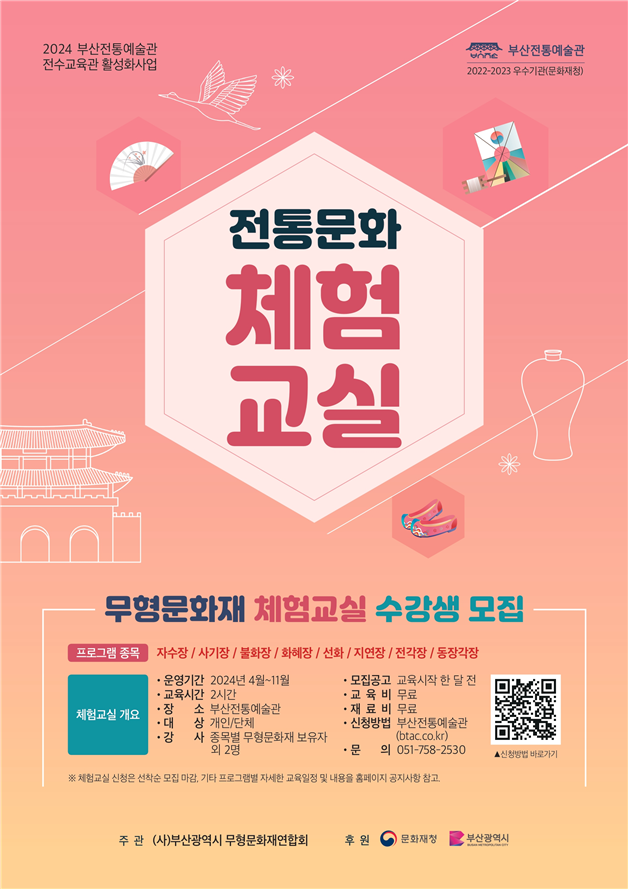 프로그램은 오는 4월 9일부터 11월 6일까지 부산전통예술관에서 진행하며, 매월 1일부터 프로그램별 선착순으로 모집한다. 수강 신청은 부산전통예술관 누리집에서 가능하다.
