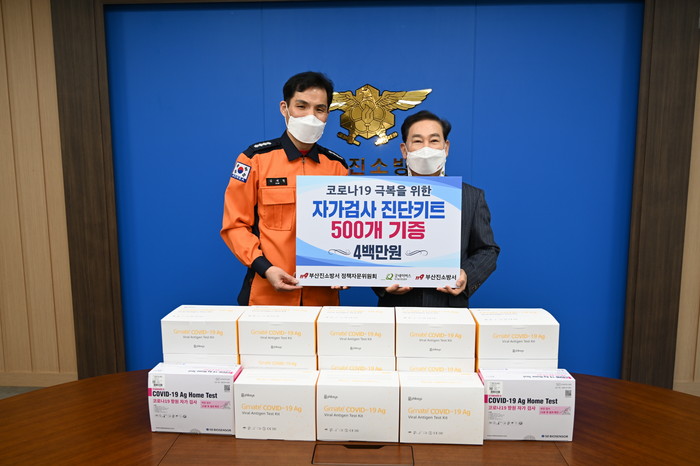 [로컬세계 부산=맹화찬 기자]부산진소방서(서장 김재현)는 지난 23일 코로나19 위기극복을 위해 코로나 자가진단 키트 500개(시가 400만원 상당) 기증행사를 진행했다고 25일 밝혔다.