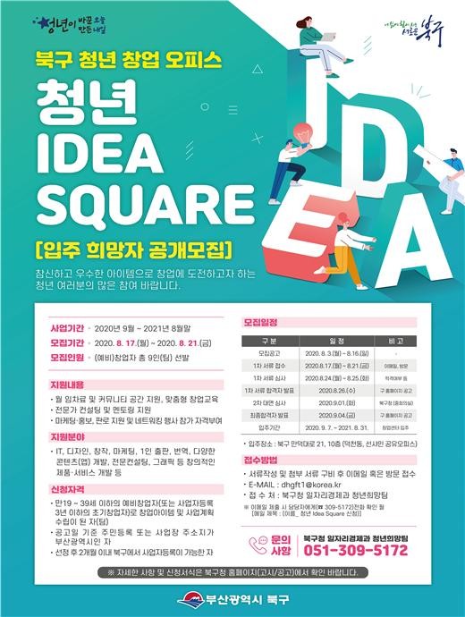 [로컬세계 맹화찬 기자]부산 북구(구청장 정명희)는 덕천동 소재 창업공간인 ‘청년 Idea Square’에 입주할 청년 창업기업을 모집한다고 3일 밝혔다.