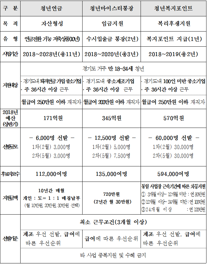 자격요건은 ▲ 공통요건으로 경기도에 거주하는 만18세~34세 청년 중 도내 중소기업에서 주 36시간 이상 근로 ▲ 세부요건은 업종, 규모, 임금에서 사업별로 차이가 있다.