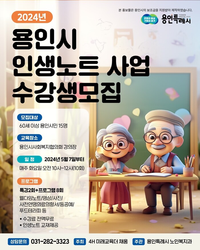 [로컬세계=김병민 기자]경기 용인특례시는 지역의 어르신들이 자신의 삶을 돌아보고 추억을 아름답게 남길 수 있도록 ‘2024년 어르신 인생노트’ 사업 수행기관 2곳을 선정했다고 23일 밝혔다.