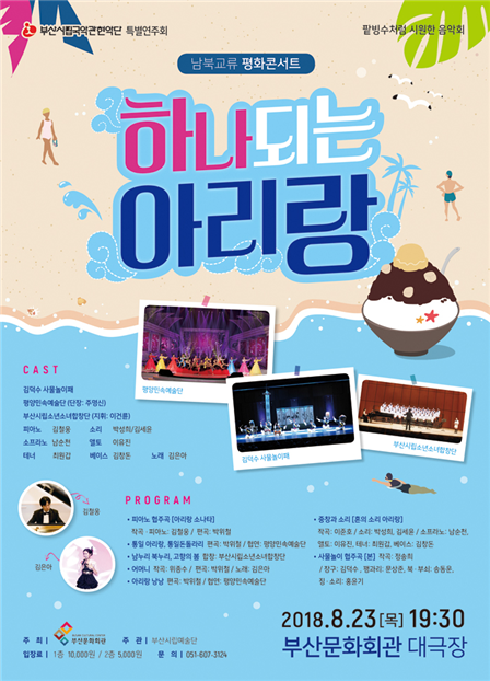 매년 8월 열리는 부산시립국악관현악단의 ‘팥빙수처럼 시원한 음악회’, 올해는 더욱 의미가 있는 무대로 우리가 하나가 되어 부르는 아리랑이 조그마한 평화의 씨앗이 되어 남북의 평화, 한반도의 평화를 불러오는 아리랑이 되었으면 하는 마음으로 꾸미는 무대이다.