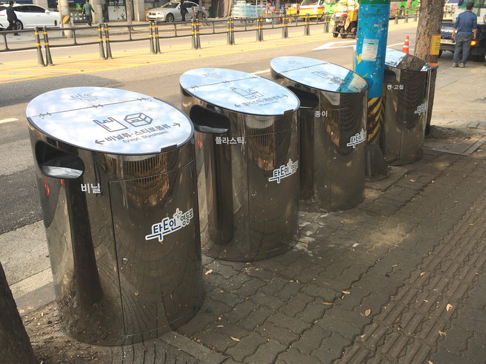 일반 주택가나 아파트에는 상시로 분리배출이 가능한 재활용품 분리수거함이 설치되어 있어 자원의 재활용률이 높은 반면, 지하철역 주변이나 버스정류장 등 보행자들이 많은 거리에는 별도의 분리수거함이 없어 쓰레기가 쌓이고 무단투기가 빈번히 발생하는 등 도시 청결을 저해하고 있다.