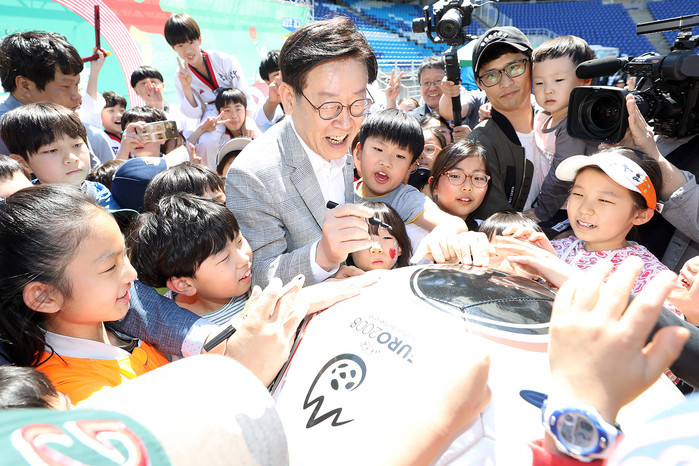 6일 오후 경기도수원월드컵경기장에서 열린 ‘어린이날 기념 경기도수원월드컵경기장 개방 행사’에서 이재명 경기도지사가 어린이들과 함께 기념볼에 싸인을 하고 있다.(사진=경기도청 제공)