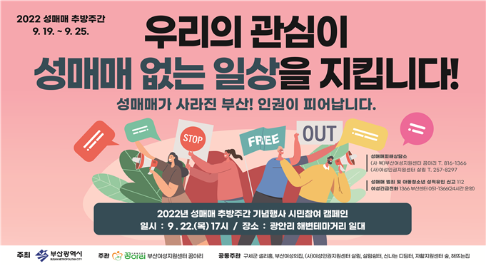 22일 오후 5시, 광안리 해변테마거리에서 사회복지법인 부산여성지원센터 꿈아리의 주관으로 개최하는 대시민 참여 캠페인 및 거리 상담에는 부산여성상담소 등 15개 기관이 참여하며, 기관별 체험부스 활동, 가출 등 위기 청소년 심리상담 및 보호시설 연계 등 성매매 근절 시민 공감대 확산을 위한 다양한 활동을 펼칠 예정이다.