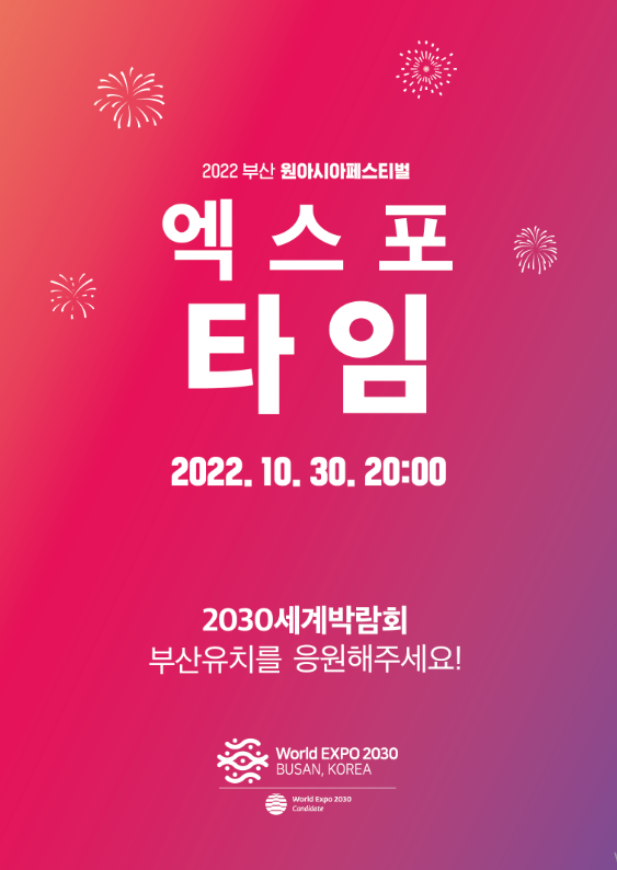 특히, 국내 정상급 아이돌과 새롭게 한류를 이끌어 갈 신인 아이돌이 참여해 한류의 ‘현재’와 ‘미래’를 그려보는 아시아 대표 문화콘텐츠 행사인 ‘2022 부산원아시아페스티벌’의 의미를 고려, 이의 연장선상으로 ‘엑스포 아워’도 부산의 ‘현재’와 ‘미래’를 소개하며 2030년부산세계박람회 유치 홍보에 적극 나설 계획이다.