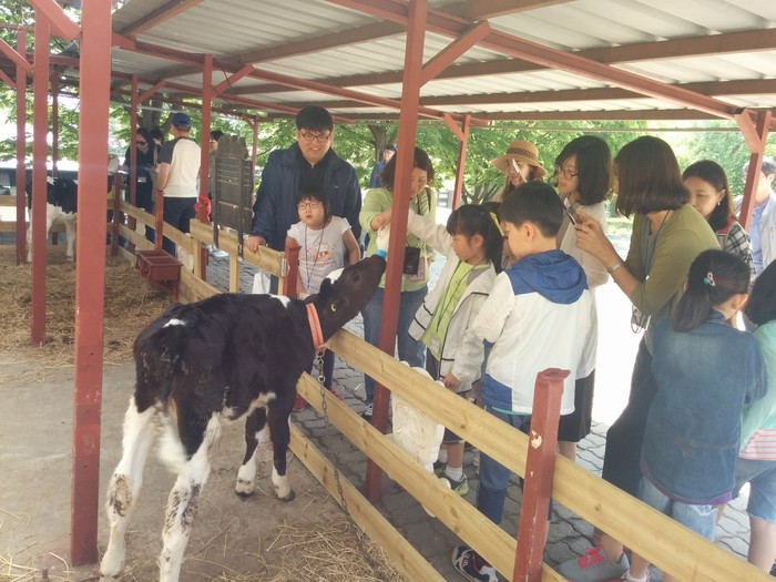▲영등포구는 오는 5월 19일 초등학생과 부모들을 대상으로 토요일 여가시간을 활용한 체험학습 프로그램 ‘토요누리체험단 방방곡곡’을 운영한다.지난해 송아지 우유주기 체험 모습.(영등포구 제공) |