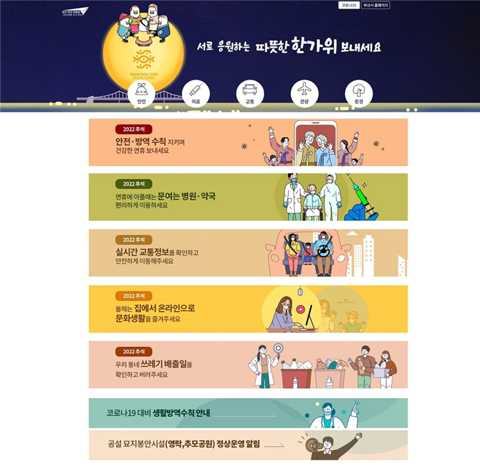 박형준 부산시장은 “추석 연휴 생활정보 안내 사이트를 통해 시민들이 코로나19 방역 수칙, 의료, 교통정보 등 연휴 기간 꼭 필요한 생활정보를 쉽고 빠르게 제공할 수 있을 것으로 기대한다”라며, “시민 여러분들의 많은 관심과 이용을 부탁드린다”고 전했다.