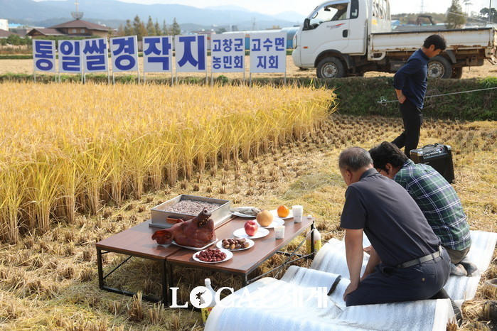 [로컬세계 로컬세계]전북 고창군 농민회(회장 이대종)가 23일 고창읍 고수면에서 통일쌀 벼베기 행사를 가졌다. 이대종 회장과 장주영 정책부장이 고사문을 낭독 하고 있다