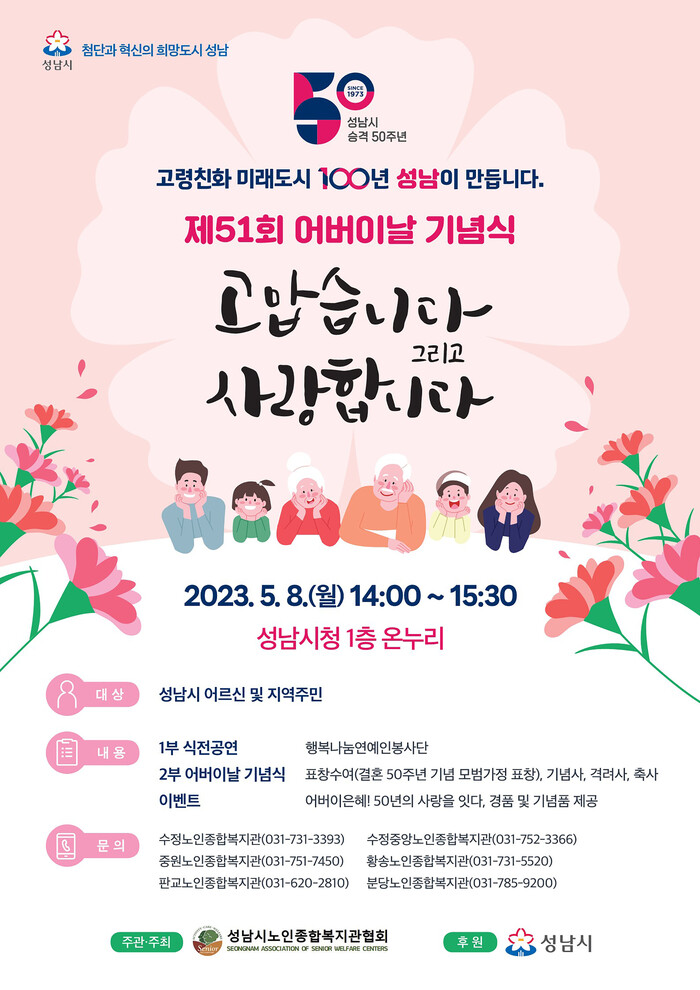 [로컬세계=김병민 기자]경기 성남시는 시 승격 50주년을 기념해 오는 8일 ‘고령 친화 미래도시 100년 성남이 만듭니다’를 슬로건으로 한 어버이날 행사를 연다고 4일 밝혔다.