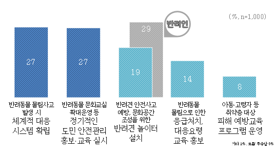 반려인과 비반려인의 갈등 해소를 위한 정책으로는 ‘물림사고 발생 시 체계적 대응 시스템 확립(27%)’, ‘반려동물 문화교실 등 정기적인 도민 안전관리 홍보·교육 실시(27%)’, ‘반려견 놀이터 설치(19%)’ 등의 순으로 나타났다. 반려견 놀이터 설치의 경우 반려인들 사이에서도 29%를 기록, 가장 높은 순위의 정책으로 꼽혔다.