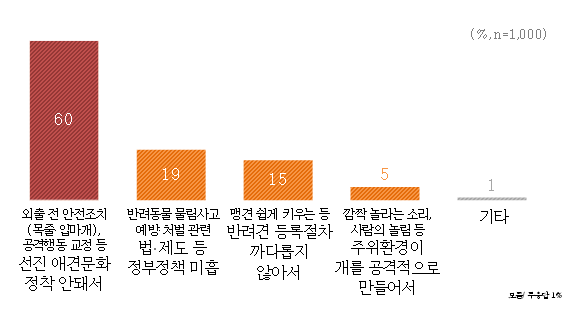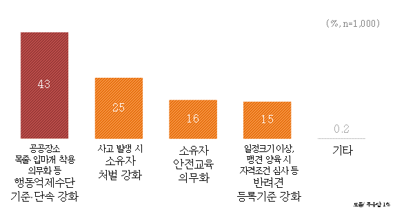 최근 개 물림 사고 원인에 대해서는 ‘목줄·입마개 등 외출 시 안전조치, 공격적 행동교정 등 선진 애견문화가 정책이 안돼서(60%)’를 높게 지적했다. 예방을 위해서는 ‘공공장소에서 목줄 및 입마개 착용 의무화 등 행동억제 수단의 기준과 단속을 강화해야 한다(43%)’고 답했다.