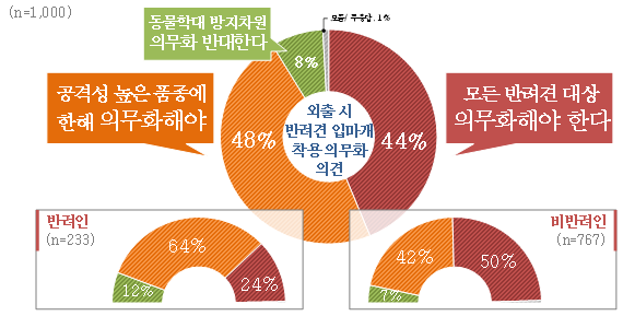 세부적으로는 ‘공격성 높은 품종에 한하여 의무화하는 방안’이 48%, ‘모든 반려견을 대상으로 의무화하는 방안’이 44%로 나타났다. 반대의견은 8%에 불과했다. 개를 키우는 반려인들도 88%가 의무화에 찬성했으며, 특히 ‘공격성 높은 품종 제한적 의무화 방안(64%)’에 무게가 실렸다.