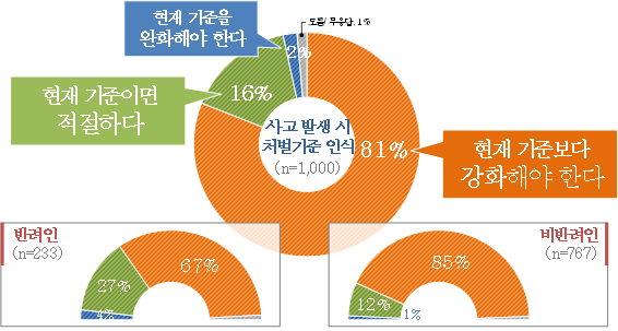 개로 인한 인명피해 발생시 현행 처벌기준에 대해서는 81%가 ‘강화해야 한다’고 답했다. 개를 키우는 반려인의 경우에도 67%가 처벌 기준 강화에 찬성했다. 현행 법제도 상으로는 최대 700만원 이하 벌금 또는 2년 이하 금고형에 처할 수 있다.