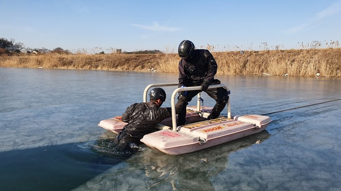 훈련은 얼음 깨짐 등 겨울철에 자주 발생하는 수난사고를 가정해 익수자를 신속히 구조함은 물론 대원의 안전사고 예방에 주안점을 두고 진행됐다.