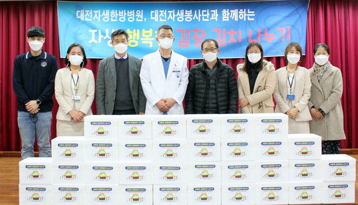 대전·청주자생한방병원 임직원 및 자생봉사단 40여 명은 이른 아침부터 추운 날씨에도 아랑곳하지 않고 김장 준비에 나서 김치를 박스에 모두 포장하기까지 구슬땀을 흘렸다. 특히 신종 코로나바이러스 감염증(코로나19) 확산에 대비해 발열 검사와 손 소독, 마스크 착용 등 방역수칙을 철저히 준수했다.
