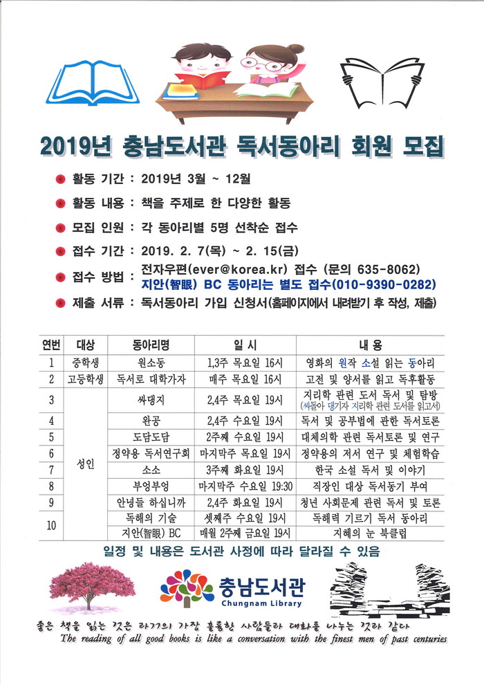 희망자는 오는 15일까지 충남도서관 홈페이지(http://library.chungnam.go.kr)에서 신청서를 작성한 뒤, 도서관을 직접 방문하거나 전자우편(ever@korea.kr)을 통해 제출하면 된다.